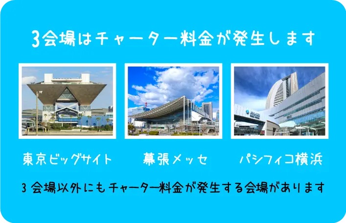 東京ビッグサイト、幕張メッセ、パシフィコ横浜の場合、必ず別途チャーター料金が発生します。